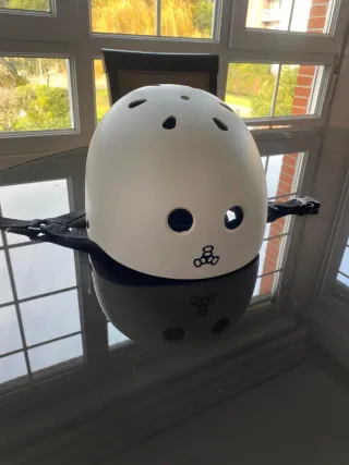 Casco de protección Talla S de la marca Triple Eight. - Color blanco. - Acolchado interior. - Cierre de correas ajustable. - Ventilación superior - Ideal para Skate, Scooter, BMX, etc.