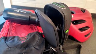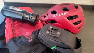 Conjunto de accesorios para ciclismo. Se puede preguntar por separado. - Casco Giro de color rojo. - Bidón de agua negro, 650 ML Tiban - Bolsa para sillín Rockbros. - Mochila rockrider st 5L - Pedales