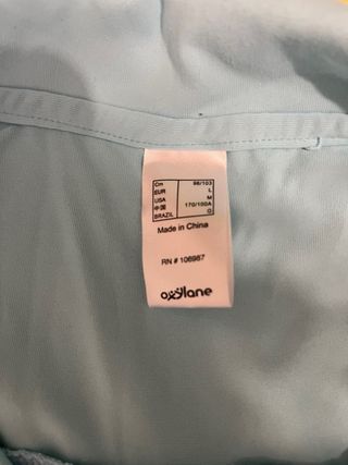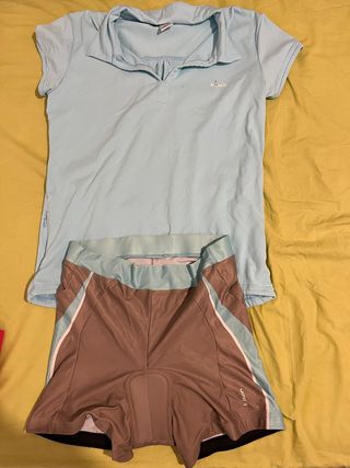 Conjunto de ciclismo para mujer de la marca Btwin. Incluye camiseta y culotte. Aunque es talla M, no es muy grande, de normal utilizo la S. - Camiseta de color azul claro con cuello polo. - Culotte corto de color marrón con detalles en azul claro y blanco.