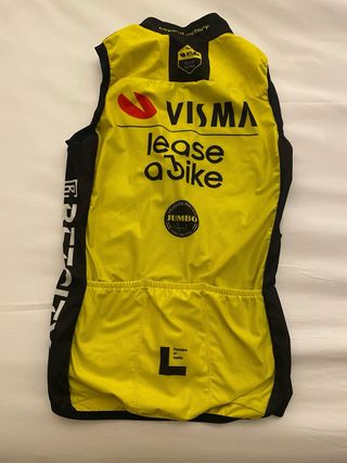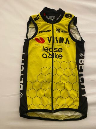 Chaleco de ciclismo Visma Lease a Bike para la temporada 2025 procedente del equipo profesional femenino - Color amarillo vibrante con detalles en negro. frontal. - Logotipos de Visma y Lease a Bike. - Talla XS.