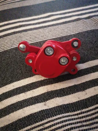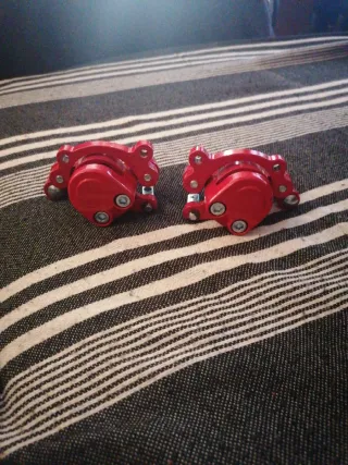 Par de frenos mecánicos de color rojo, ideales para moto o bicicleta. Son un repuesto funcional y estético. - Color: Rojo. - Tipo: Mecánico. - Compatibilidad: Moto y bicicleta.