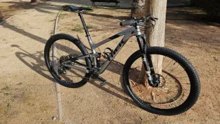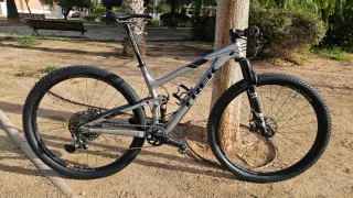 Trek Top Fuel 8 del año 2019, talla 17,5” (M/L), doble suspensión XC de 29”. Componentes: Amortiguador trasero FOX Float DPS EVOL Transmisión SRAM Eagle 1x12 Horquilla RockShox Recon RL con bloqueo remoto Cuadro: Trek Top Fuel aluminio Alpha Platinum, 100 mm Horquilla: RockShox Recon RL 100 mm (bloqueo remoto) Amortiguador: FOX Float DPS EVOL Transmisión: SRAM Eagle 1x12 (plato 32T) Frenos: Shimano hidráulicos (180 / 160 mm) Ruedas: Bontrager 29” Boost Componentes: Bontrager (manillar, potencia, tija y sillín) Sensor de velocidad y cadencia Garmin Se pueden mandar mas fotos por WhatsApp.