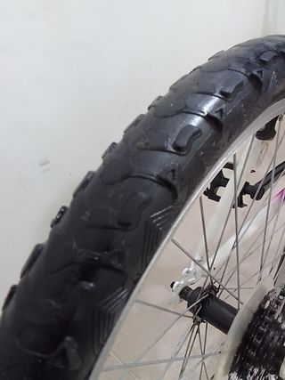 Bicicleta de montaña Speed de 24 pulgadas, en buen estado. - Color blanco y morado - Sillín negro. - Timbre azul en el manillar. - 18 velocidades