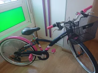Bicicleta híbrida B'Twin para niños, ideal para iniciarse en el ciclismo. - Cuadro de acero resistente. - Ruedas de 24 pulgadas. - Frenos V-brake. - Sillín ajustable en altura. - Guardabarros delantero y trasero. - Diseño en color negro y rosa.