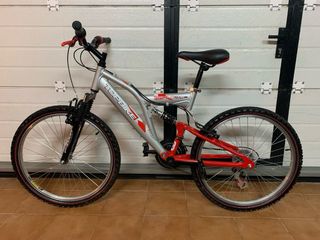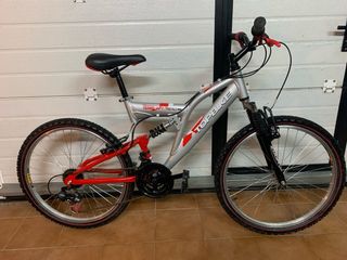Bicicleta de montaña Top Bike en color plateado y rojo, con ruedas de 24 pulgadas. - Cuadro de aluminio. - Suspensión delantera y trasera. - Frenos de disco. - Cambio Shimano.