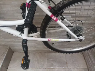 Bicicleta de montaña en color blanco con detalles en rosa, ideal para jóvenes ciclistas. - Ruedas de 24 pulgadas. - Frenos. - Bomba inflador, timbre y soporte botella. - Sillín ajustable con funda acolchada. - Funda color negra para resguardo. - Soporte para colgar bicicletas