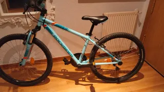 Bicicleta infantil de montaña en color azul con detalles naranjas 24 pulgadas. - Cuadro de aluminio. - Frenos V-Brake. - Suspensión delantera. Bici 24' en muy buen estado , transmisión Shimano , cubiertas nuevas,son las que traía ,ahí se ve el poco uso