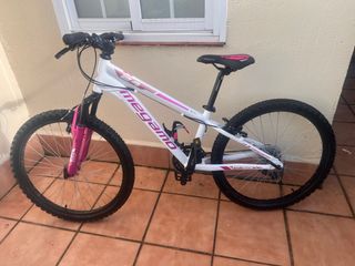 Bicicleta infantil de montaña Megamo con ruedas de 24 pulgadas. - Cuadro de aluminio. - Frenos V brake. - Suspensión delantera. - Color blanco y rosa.