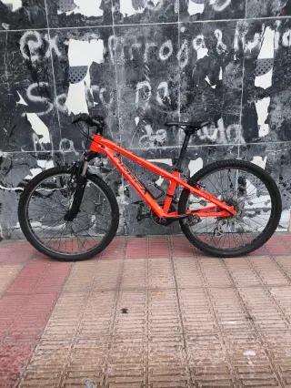 Bicicleta Orbea MX 24 en color naranja. - Cuadro de aluminio. - Ruedas de 24 pulgadas. -Horquilla de suspensión. -Cambio Shimano Altus de 8 velocidades.