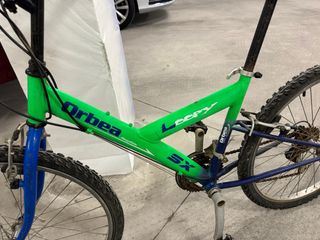 Bicicleta Orbea modelo SX de 24 pulgadas con un llamativo color verde y detalles en azul. Ideal para disfrutar del aire libre. - Cuadro Orbea de color verde brillante. - Horquilla delantera azul. - Ruedas todoterreno. - Cambio y frenos visibles.