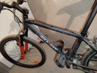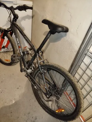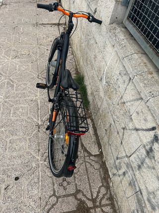 Bicicleta de montaña Rock 04 en color negro con detalles en naranja. Ideal para paseos y aventuras, nunca se ha usado. - Cuadro robusto. - Ruedas de 24 pulgadas. - Frenos de disco. - Cambio de marchas. - Guardabarros delantero y trasero. - Portabultos trasero.