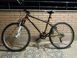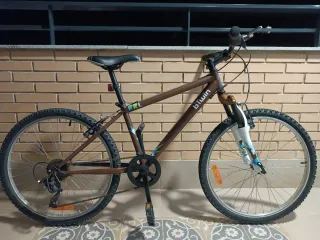 Bicicleta de montaña Btwin en color marrón. Ideal para edades de 8 a 12 años. Está en muy buen estado, con algunas señales normales de uso. Además, se regala el casco. Medidas: 24 pulgadas. -Horquilla con suspensión. -6 velocidades. -Lista para usar.