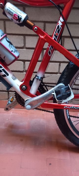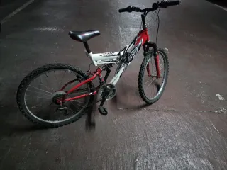 Bicicleta de montaña con ruedas de 24 pulgadas. - Cuadro de color rojo y blanco. - Diseño de doble suspensión.