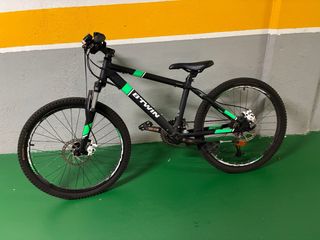 Bicicleta de montaña Rockrider en color verde brillante. - Cuadro de aluminio. - Suspensión delantera. - Frenos de disco. - Ruedas de 24 pulgadas. -Ruedas nuevas, muy poco uso.