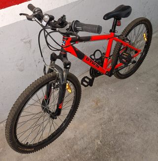 Bicicleta de montaña B'Twin en color rojo, ideal para iniciarse en el ciclismo. - Cuadro de aluminio. - Ruedas de 24 pulgadas. - Frenos V-brake. - Cambio Shimano de 6 velocidades.