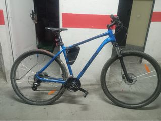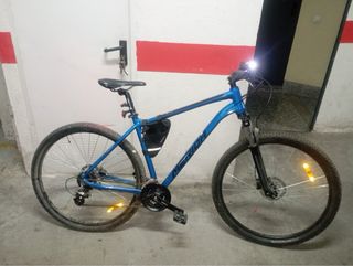 Bicicleta Merida en color azul. COMO NUEVA. - Focos LED recargables - Ruedas de 29 pulgadas. - Frenos de disco. - Cambio Shimano. 24 marchas. Se la compré a mi hijo y la ha usado 4 veces, está nueva, se puede ver sin comoromiso. Me costó 520 más los accesorios incluye: dos luces led recargables, bolsillo para movil, bolsillo triangulo, candado.