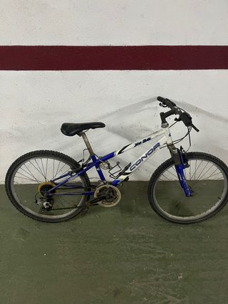 Bicicleta de montaña Conor Xe 24, ideal para iniciarse en el ciclismo. - Cuadro de aluminio. - Ruedas de 24 pulgadas. - Frenos V-Brake. - Cambio Shimano. Bicicleta infantil con algunas manchas de oxido por los años pero en general buen estado. Bicicleta blanca en buen estado, pero con el freno trasero con algun fallo i el timbre no funciona, lo demas todo bien