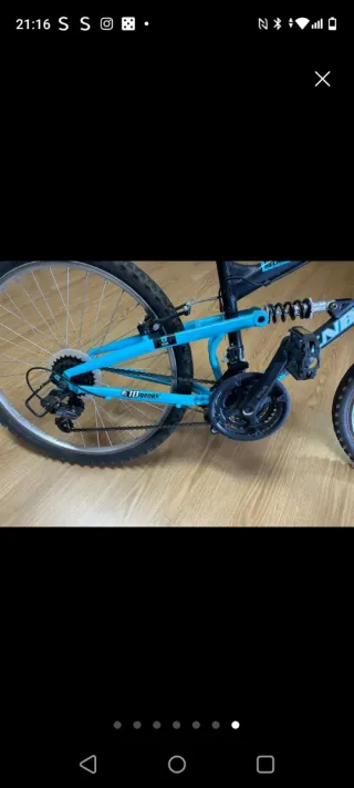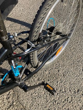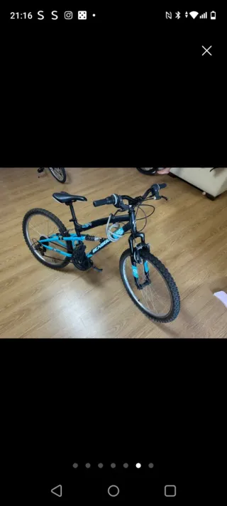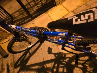 Bicicleta de montaña con suspensión delantera y trasera, ideal para niños y jóvenes. Tiene dos años, con muy poco uso y siempre en garaje tapada. - Cuadro negro con detalles en azul. - Ruedas de 24 pulgadas. - Frenos de disco.