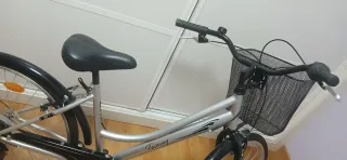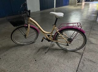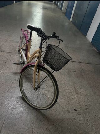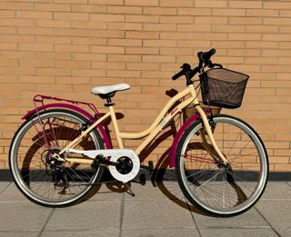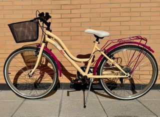 Bicicleta de paseo en color beige con detalles en rosa. En buen estado y con diferentes marchas. - Rueda de 24 pulgadas. - Cesta delantera. - Guardabarros delantero y trasero. - Portabultos trasero.