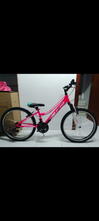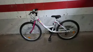 Bicicleta de montaña para niña con ruedas de 24 pulgadas. Ideal para iniciarse en el ciclismo. - Cuadro blanco con detalles en color fucsia. - Ruedas de 24 pulgadas con buen agarre. - Manillar negro con puños cómodos. - Sillín negro con detalles en rosa. Esta en perfecto estado, se puede ver y probar.