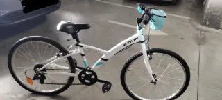 Bicicleta B'TWIN Daniella de 24 pulgadas. - Color blanco con detalles en azul y gris. - Ruedas de 20 pulgadas. - Frenos. - Sillín ajustable. - Incluye caballete y cesta - Cambio de piñones en puños Sólo usada en dos ocasiones. Estado nueva. Venta en persona. Se puede ver No se realiza envío.