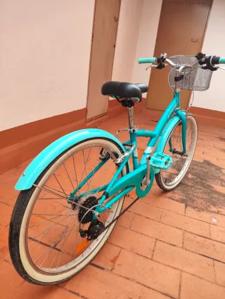 Bicicleta de paseo B'TWIN de 24 pulgadas, ideal para niños de 8 a 12 años. Diseñada para disfrutar de paseos cómodos. - Color azul turquesa. - Cesta delantera. - Guardabarros.