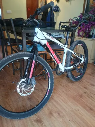 Bicicleta de montaña con ruedas de 24 pulgadas, ideal para jóvenes ciclistas. - Cuadro de aluminio ligero. - Frenos de disco. - Cambio de marchas Shimano. - Algunos desperfectos superficiales por el uso pero funciona perfectamente.