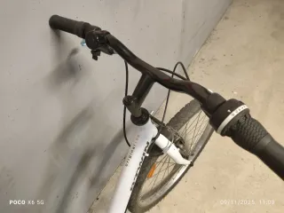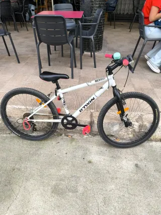 Bicicleta Btwin Rockrider en color blanco. - Cuadro de aluminio. - Ruedas de 24 pulgadas. - Frenos V-brake. - Suspensión delantera.