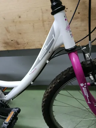 Bicicleta Rockrider para niña, en color blanco y detalles morados. Necesita puesta a punto. - Modelo Rockrider. - Talla 24 pulgadas. - Color blanco con detalles morados.