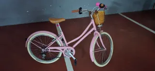 Bicicleta clásica para niña, tamaño 24 pulgadas, en color rosa. Se encuentra como nueva y viene con extras. - Cesta delantera de mimbre. - Sillín y puños de cuero marrón. - Guardabarros delantero y trasero. - Timbre rosa y pata