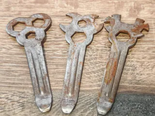 Conjunto de herramientas para desmontaje de bicicletas clásicas. Son piezas metálicas con un diseño robusto. - Fabricadas en metal. - Presentan signos de óxido debido al paso del tiempo. - Ideales para coleccionistas o restauradores de bicicletas antiguas.