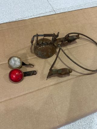 Conjunto de piezas para bicicletas antiguas, ideal para restauraciones o proyectos. - Faro delantero metálico. - Faro trasero rojo. - Dinamo. - Reflectante rojo. - Sillín de cuero. - Puños rojos. - Varias piezas de sujeción y varillas.