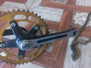 Juego de bielas Sugino Maxy Cross de 3 piezas para BMX, estilo antiguo. Está en buenas condiciones, con algunas señales de uso. Biela Sugino Maxy Cross de 3 piezas con plato Sugino dorado. Tomada de una Kuwahara KZ de 20" que hice en 2006. Todas las piezas eran nuevas al ensamblarla. La bicicleta se usó solo unos días y luego se expuso, así que está prácticamente nueva. - Bielas de 3 piezas. - Modelo Sugino Maxy Cross. - Para bicicleta BMX.
