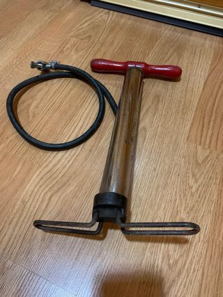 Bombín de aire de estilo antiguo, con un diseño clásico y funcional. - Cuerpo principal metálico con acabado cromado. - Empuñadura en forma de T con mangos rojos. - Base con soportes para los pies. - Manguera flexible negra con boquilla.