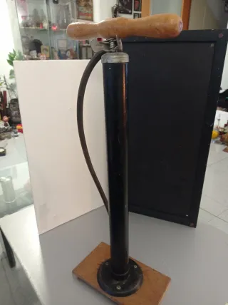 Bomba de aire clásica para bicicletas o motocicletas. Cuerpo principal de metal negro,base y empuñadura de madera. Ojo, no es funcional salvo que sepas repararla. Se vende como objeto decorativo o atrezzo. 55 cm de altura, queda espectacular como complemento en tienda de bicicletas o motos. Antiguo, vintage, decoración atrezzo tienda escaparate teatro antico decorazione