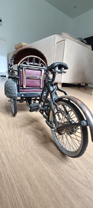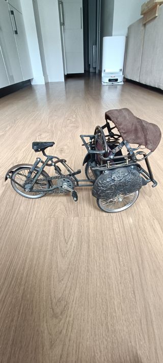 Preciosa miniatura de un antiguo rickshaw de bicicleta. Ideal para decoración. - Se encuentra en buen estado. - Elaborada con metal. - Diseño detallado. - Perfecta para coleccionistas.