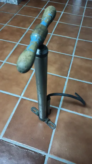 Bomba de aire manual de estilo vintage. Ideal para coleccionistas o para darle un toque retro a tu espacio. - Cuerpo metálico. - Mango de madera con detalles en azul. - Base con soportes para fijación.