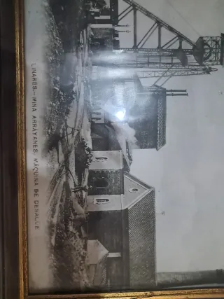 Fotografía antigua enmarcada de Linares, Mina Arrayanes. Y de ka cakke salmeron - Medidas del cuadro: 35 x 45 cm. - Representa la máquina de desmalezar.