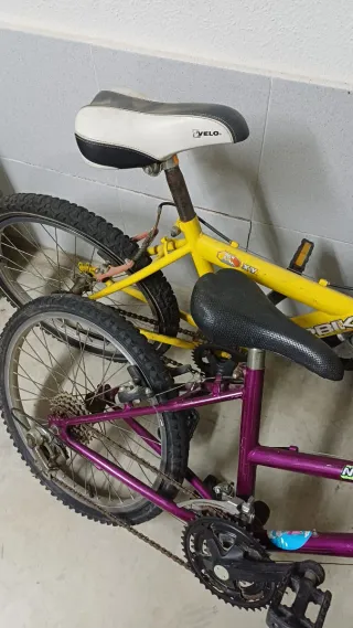 Se venden dos bicicletas infantiles, una morada y otra amarilla. Muy antiguas pero se pueden usar. Las ruedas habría que inflarlas. 18 euros las dos. - Bicicleta morada con cesta rosa. - Bicicleta amarilla con logo TOPBIKE.
