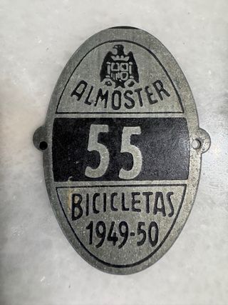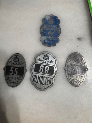 Conjunto de placas de matrícula para bicicletas antiguas, con números y marcas de época. - Placa REUS Velomotores 1959 - Placa ALMOSTER 55 BICICLETAS 1949-50 - Placa ALMOSTER 69 BICICLETAS - Placa ALMOSTER 71 BICICLETAS 1949-50 -Placa identificativa perros Almoster 12 € unidad