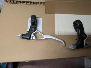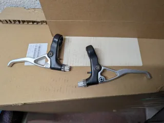Par de manetas de freno Kona C3 Curve, para sistema cantilever. En muy buen estado, retiradas hace muchos años de la bici y guardadas en una caja. Una reliquia del pesado para restaurar tu bici antigua 😊 - Aluminio. - Mecanismo de ajuste.