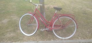 Bicicleta clásica de color rojo, ideal para paseos urbanos. Está en buen estado, lista para usar. - Modelo antiguo, con detalles estéticos vintage. - Llantas blancas. - Portaequipajes trasero.