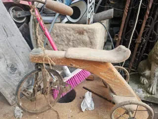 Este triciclo vintage es una pieza decorativa con encanto. - Estructura principal de madera. - Ruedas metálicas. - Asiento de madera. - Manillar de madera.