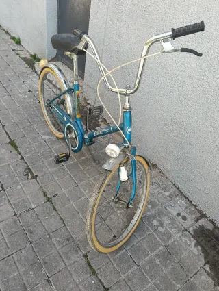 Antigua bicicleta años 60-70 100% fabricación española BH, apareció en la casa de una herencia, muy bien conservada, todo original. Se le han puesto cámaras nuevas en tienda especializada exactamente iguales. Para lubricar, restaurar y revisar y ajustar cables de freno. Funciona bien. Se puede ver sin compromiso