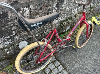 Bicicleta clásica BH modelo Bicicross en color rojo. Una auténtica reliquia totalmente funcional,Un diseño icónico para disfrutar. - Cuadro de metal. - Manillar con puños naranjas. - Sillín negro con asa. - Ruedas con llantas plateadas. -pata para apoyar.neumáticos negros.