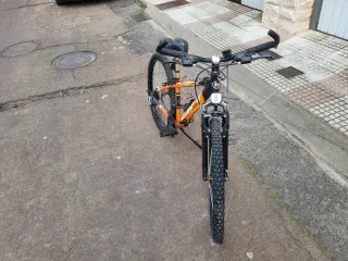 Bicicleta de montaña BH Overx en color naranja y negro. Ideal para iniciarse en el ciclismo. - Cuadro de aluminio. - Suspensión delantera. - Frenos de disco. - Ruedas de 26 pulgadas. -Botellero -Cuernos y sillin goma espuma -Reflectante delantero y trasero