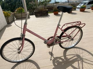 Bicicleta plegable BH antigua, ideal para restaurar. Es roja y se encuentra en buen estado general, aunque muestra señales de uso. - Marca: BH - Modelo: Plegable - Color: Rojo - Tiene portaequipajes trasero.