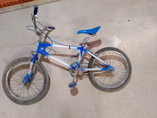 Bicicleta BMX de estilo antiguo, ideal para coleccionistas o para darle un toque retro a tus paseos. - Cuadro resistente. - Ruedas con llantas de color azul. - Manillar curvo característico de las BMX.