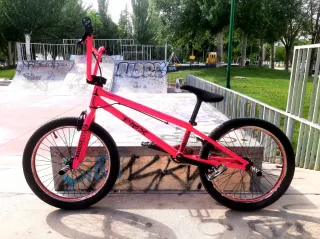Bicicleta de BMX personalizada en color rosa fluorescente, con ruedas de 20 pulgadas. Todo un capricho para estos Reyes. - Hecha prácticamente ha piezas. - Rotor interno un solo cable. - sillín pivotal. - Los pegs son más bien por estética (adorno), no son muy resistentes. - a continuación piezas nuevas: Manillar, potencia, puños, rotor interno, frenos delantero y trasero completos con zapatas de silicona transparente, bielas y plato, cadena de medio eslabón y cubiertas.