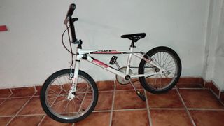 Bicicleta BMX Trotter para niños, ideal para iniciarse en el mundo del BMX. Su diseño es llamativo y resistente. - Cuadro de metal plateado y detalles en azul. - Ruedas de 20 pulgadas. - Sillín con detalles en azul. Tiene oxidada la cadena y le falta un cable de freno de delante. Por lo demás está bien.